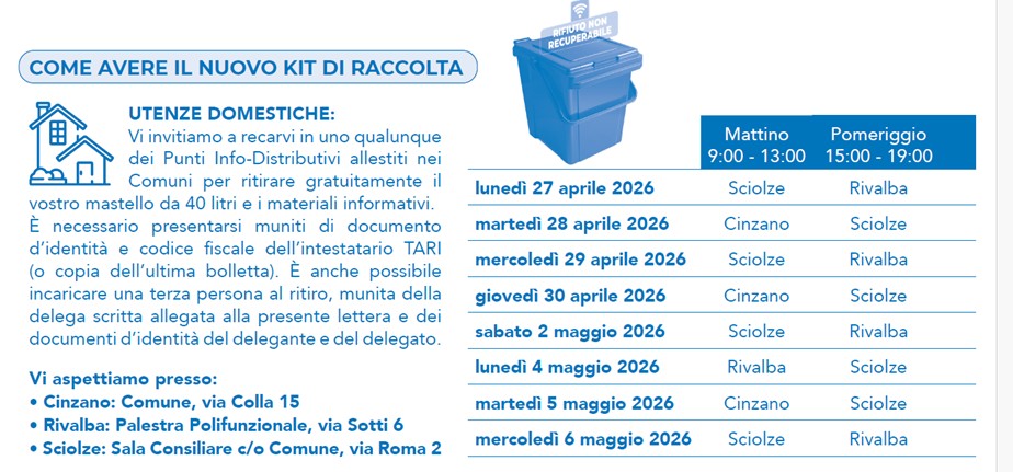 I comuni di Sciolze, Rivalba, Cinzano, Gassino Torinese, Castiglione Torinese e San Raffaele Cimena, insieme a Seta S.p.A. e al Consorzio di Area Vasta CB 16, stanno per avviare un importante aggiornamento del sistema di raccolta rifiuti introducendo la TARIP (TARIFFA RIFIUTI PUNTUALE).